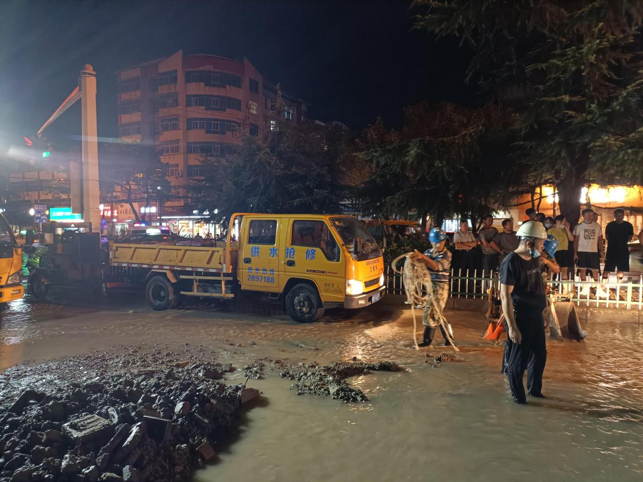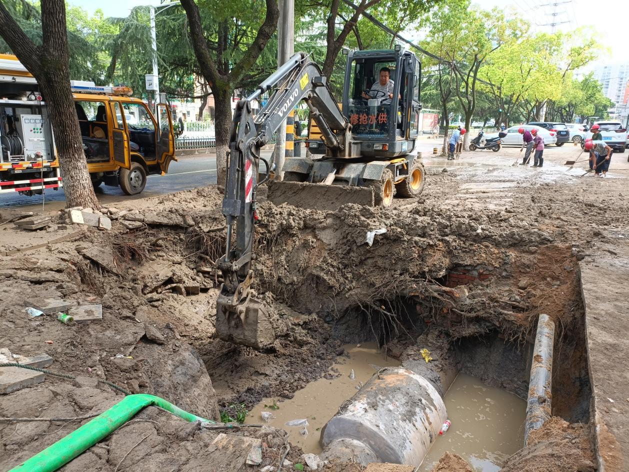 在搶修現(xiàn)場看到,公司副經(jīng)理曾國剛、運維部部長劉要華正在組織工作人員設(shè)置路障,指揮挖掘機開挖路面、清理淤泥。2輛搶修車停在路邊,保障后勤需要,10余名工作人員正在分工明確地投入到緊張的搶修中。