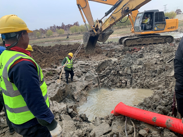孝感城區(qū)向云夢供水的DN1200主管道于2013年建成通水,是供給云夢縣城鄉(xiāng)生產(chǎn)生活用水的唯一通道。由于爆管位置恰處于澴河主河道中央,盡管枯水季水位不高,但管道口徑大、埋深大,現(xiàn)場搶修仍面臨極大的困難。預(yù)案啟動后,市住房和城市更新局、澴川國投集團(tuán)和公司相關(guān)負(fù)責(zé)人第一時間趕到現(xiàn)場調(diào)度指揮,會同技術(shù)人員現(xiàn)場研判分析,迅速制定了搶修方案。