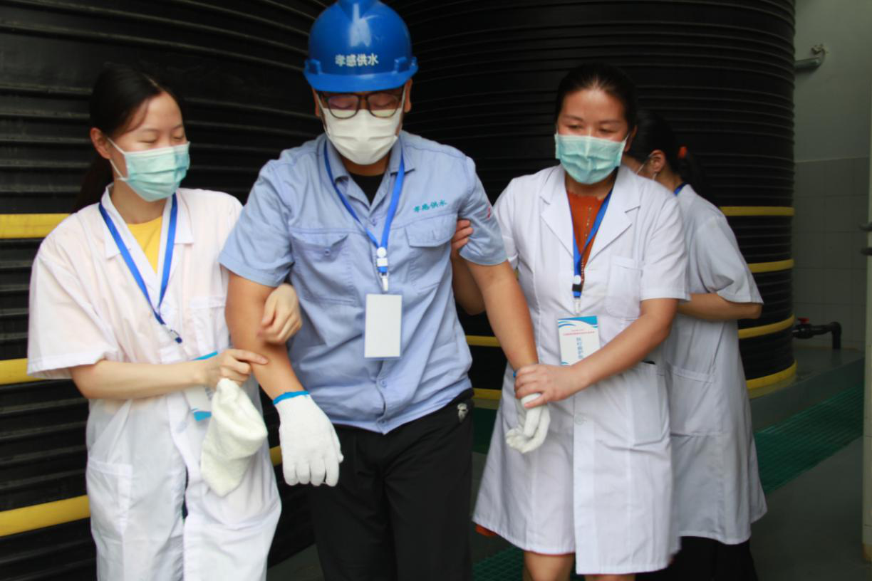 此次演練是以正在使用中的儲液罐的底部破裂,導(dǎo)致次氯酸鈉大量外泄為背景。當(dāng)天上午9:30分,演練正式開始。值班人員在巡視過程中被次氯酸鈉藥劑噴濺至手臂受傷,值班班長立即報告總指揮,總指揮下令立刻全面啟動次氯酸鈉應(yīng)急處置預(yù)案,通訊聯(lián)絡(luò)組、醫(yī)療救護(hù)組、安全疏散組、現(xiàn)場處置組前往現(xiàn)場開展救援及搶修。