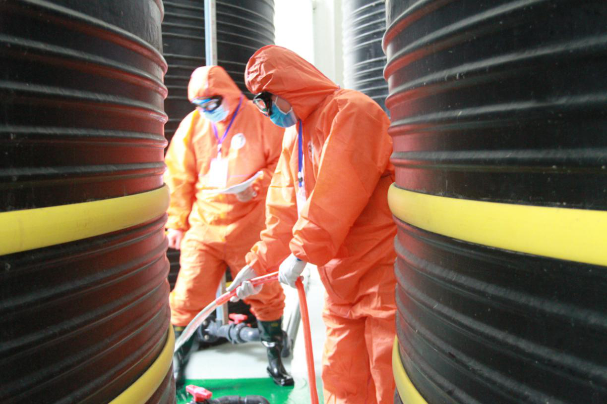到達(dá)事故發(fā)生現(xiàn)場,醫(yī)療救護(hù)組迅速將受傷人員轉(zhuǎn)移至安全區(qū)域,按救護(hù)要求進(jìn)行現(xiàn)場應(yīng)急救護(hù),并同時撥打120急救電話,將傷者送醫(yī)院救治。隨后現(xiàn)場處置組搶修人員穿戴防護(hù)服進(jìn)入事故現(xiàn)場,關(guān)閉相連儲液罐的聯(lián)通閥門并找到漏點(diǎn),用專業(yè)工具進(jìn)行堵漏,在漏點(diǎn)周圍圍堰攔截泄漏的次氯酸鈉,并進(jìn)行稀釋、中和,然后收集處理最后將罐體中的剩余次氯酸鈉溶液轉(zhuǎn)至備用罐中。在確認(rèn)事故現(xiàn)場漏點(diǎn)無泄漏后匯報給現(xiàn)場總指揮。演練結(jié)束后,現(xiàn)場指揮進(jìn)行了總結(jié),認(rèn)真分析了演練過程中暴露出的一些問題,為處置預(yù)案的進(jìn)一步完善提供了一手資料。