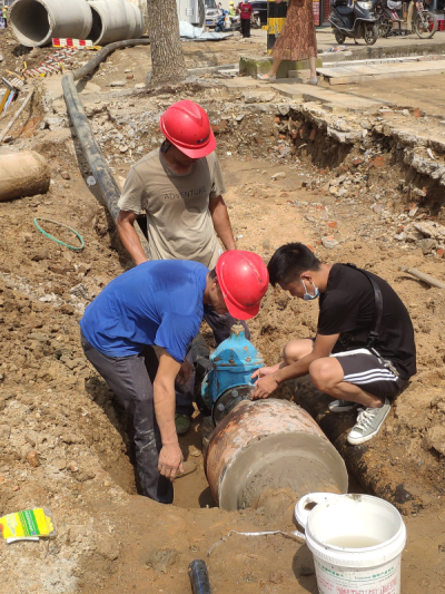 8月19日上午室外溫度已達35℃,管道工們克服高溫,奮力搶修,終于在下午5點前修好了供水管道,解決了群眾用水問題。