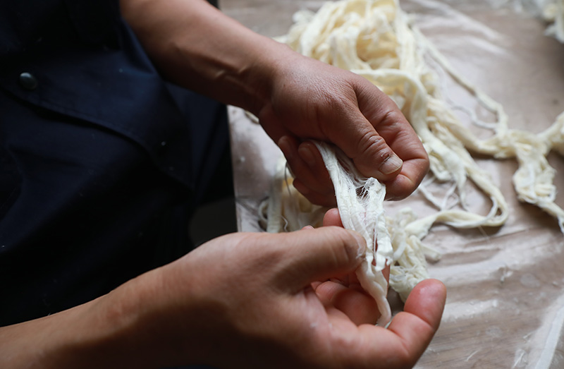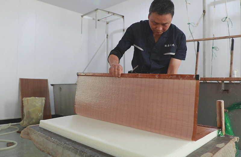 徽州傳統(tǒng)手工楮皮紙,采用傳統(tǒng)手工抄紙工藝,經(jīng)過(guò)27道工序,以手工精細(xì)制作而成,產(chǎn)品主要有楮皮紙、云龍紙、皺紋紙、落水紙、棉紙、版畫(huà)、攝影畫(huà)、手撕畫(huà)專用紙。 生產(chǎn)工序: 浸泡—→腳踏—→清水蒸煮—→切料—→石灰漿浸泡—→蒸煮—→自然漂洗—→腳踏