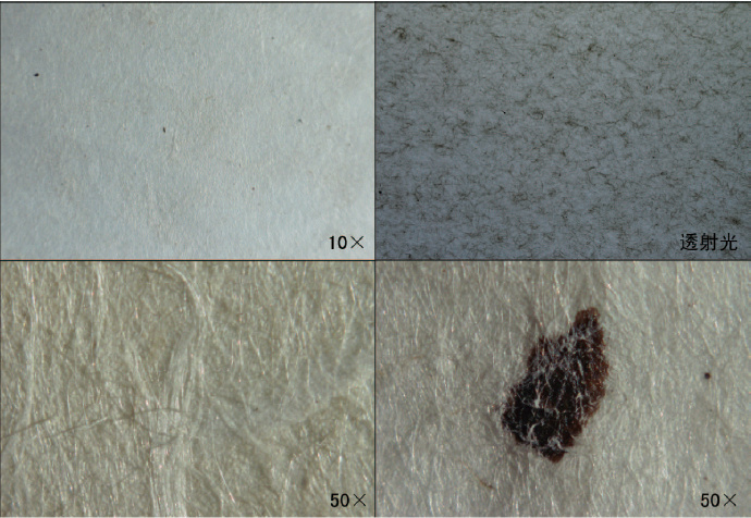 構(gòu)皮纖維雖不及麻纖維那么長(zhǎng),但遠(yuǎn)長(zhǎng)于竹纖維,一般在5-10mm 左右。由于構(gòu)皮本身具有一定的白度,纖維素含量也比較高,因此構(gòu)皮紙成紙白度一般要高于麻紙和竹紙,構(gòu)皮紙質(zhì)地較麻紙綿軟,韌性好,常被稱(chēng)為“白棉紙”,亦有“蟬翼”、“冰肌”等雅喻。構(gòu)皮紙紙面的勻度和平滑度一般介于麻紙和竹紙之間,由于蒸煮過(guò)程中用到草木灰,構(gòu)皮紙一般潔白中略偏灰色,紙面纖維在光線照射下會(huì)泛出絲質(zhì)光澤。由于纖維較長(zhǎng)不易分散,成紙內(nèi)常見(jiàn)有未打散的纖維束,形態(tài)蜿蜒曲折,兩端多散開(kāi)呈絮狀(如圖1 左下)。構(gòu)皮紙?jiān)诖娣乓欢螘r(shí)間之后,紙面常見(jiàn)有零星的淺銹黃色暈點(diǎn)狀氧化斑,曾有文人墨客因此雅稱(chēng)其為“桃花紙”。另外,手工抄造的構(gòu)皮紙?jiān)诶w維間還常會(huì)殘留一些構(gòu)皮外皮的黑灰色碎屑,這也是構(gòu)皮紙的一個(gè)特征(如圖1 右下)。