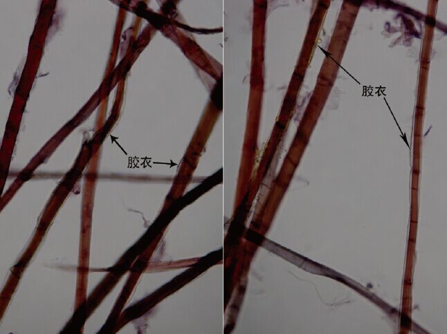 在200 倍鏡下,可觀察到構(gòu)皮纖維具有明顯的細(xì)胞腔,但細(xì)胞腔大小不一。細(xì)胞壁上的橫節(jié)紋愈加明顯清晰,紋理深淺各異,大多數(shù)橫節(jié)紋跟纖維橫切面約成15~20°的夾角。部分纖維細(xì)胞的外壁包裹有一層透明膜,稱(chēng)為膠衣(如圖3),一般多呈斷續(xù)狀,并會(huì)隨著纖維被處理程度的加重而減少,有些甚至被剝離成碎片飄散于纖維之間,在纖維的端部膠衣相對(duì)比較明顯。